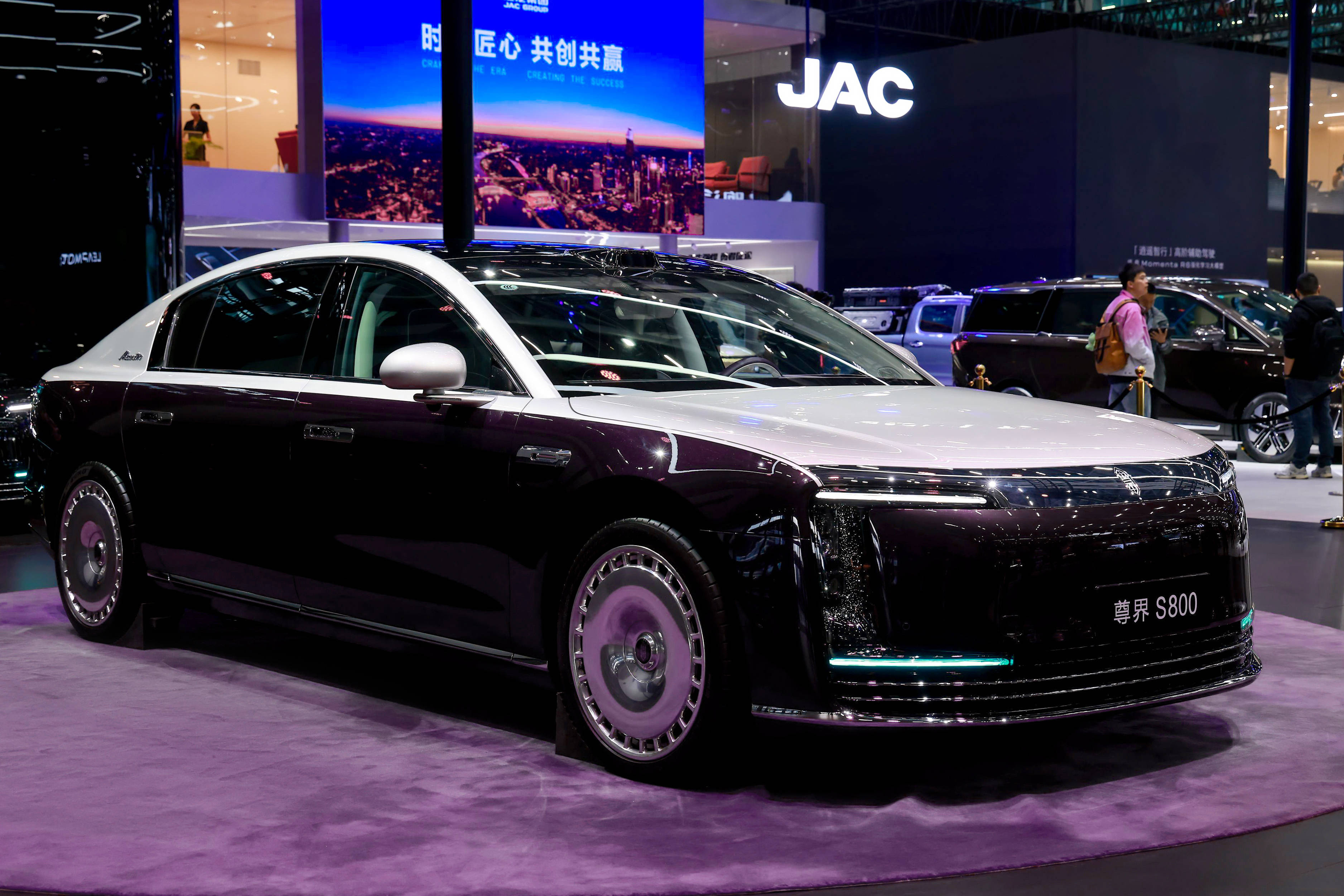 在此次廣州車展江淮汽車尊界展臺,分別擺放著一臺紫銀雙色和一臺純黑色的尊界S800。