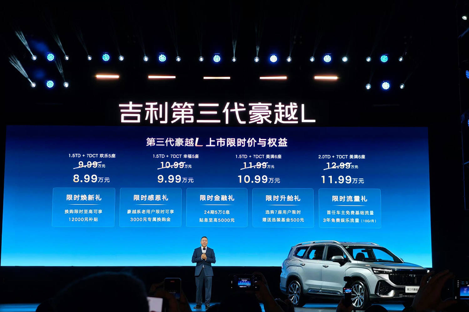 2025年11月27日,新款吉利豪越L正式上市,共推出四款配置,指導價區間為9.99-12.99萬元,上市限時價區間為8.99-11.99萬元。新車針對外觀、內飾和動力系統均有升級,將會搭載Flyme Auto智能座艙系統,車內提供5/6/7座三種座椅布局。