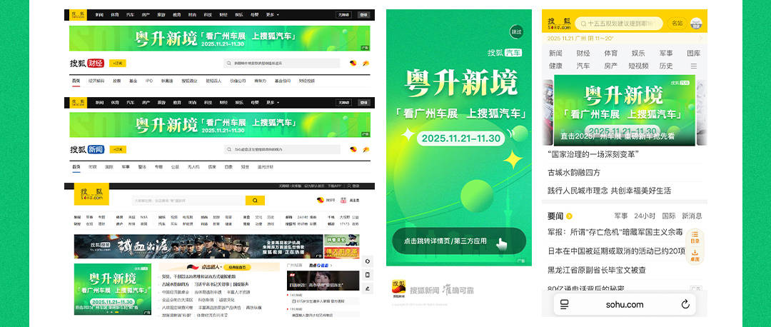 展會期間,依托內容和用戶領域的寬廣性優勢,搜狐聚合平臺旗下全矩陣資源,海量推送車展優質內容,有效觸達汽車用戶。進入搜狐網首頁及搜狐新聞、汽車、財經頻道頁面、手機搜狐網、搜狐新聞客戶端APP多個平臺,均可點擊進入搜狐汽車“粵升新境”2025廣州車展報道專題。同時,車展內容也同步覆蓋了抖音、快手、小紅書、微博、視頻號等平臺,助力引導流量,搶占跨圈熱度。