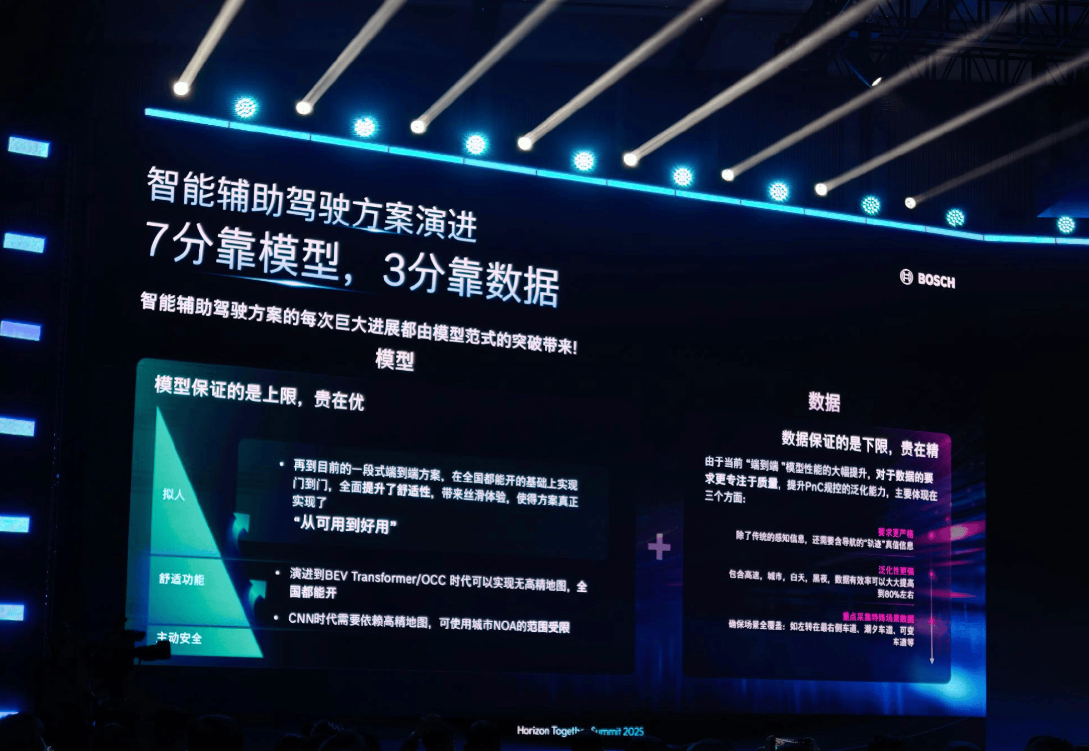 3、博世認為現在智能輔助駕駛方案演進“7分靠模型、3分靠數據”——輔助駕駛方案的巨大進展都是由模型范式的突破帶來的,一段式端到端方案的主要優勢是擬人和泛化能力強。而3分靠數據是指數據保證的是下限,貴在“精”,高質量數據可以提升PnC規控的泛化能力。現在博世認為高質量數據會要求更嚴格,比如除了傳統的感知信息,還需要包含導航的“軌跡”真值信息;其次是包含高速、城市、白天、黑夜信息,數據有效率可以大幅提高到80%左右;再次是需要采集特殊場景的數據,比如左轉右轉、潮汐車道、可變車道等。