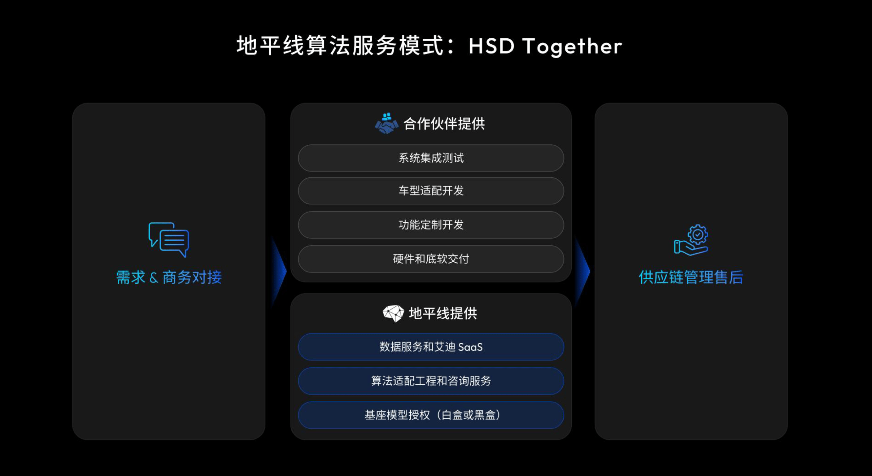 因此,地平線宣布,他們將其已驗證的全棧能力,以全新的“算法服務”模式——HSD Together,向整個行業開放。在此模式中,合作伙伴可以聚焦于自身優勢:系統集成測試、車型適配開發、功能定制開發、硬件與底軟交付;地平線則提供覆蓋產品開發全周期的“算法服務”,包括:數據服務與艾迪SaaS平臺、專業的算法適配工程與咨詢服務,以及最核心的基座模型授權。余凱介紹:“HSD Together算法服務模式的根本目的,是讓合作伙伴能夠基于地平線已驗證的成熟智能基座,將產品開發中的人力投入、算力消耗與上市周期,均大幅降低90%。”